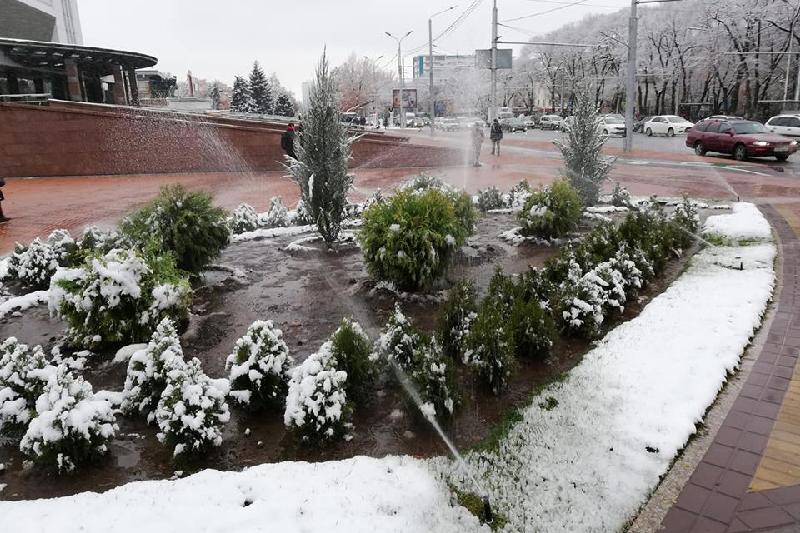 Алматыда Балуан Шолақ атындағы спорт сарайының алдындағы газон суарылып жатыр. Қарлы-жауынды күнде бұл құбылысты қала тұрғындары түсінбей әлек.