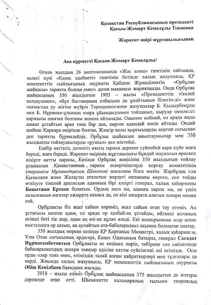 Аса құрметті Қасым-Жомарт Кемелұлы! Елдің намысын, ар ұятын қорлайтын еларасында араздық пен алауыздық туғызатын және ешбір дәлелі мен негізі жоқ жалалармен тарихымызды бұрмалаушыларды тоқтататын бір шара қолдануыңызды ел атынан өтінеміз.