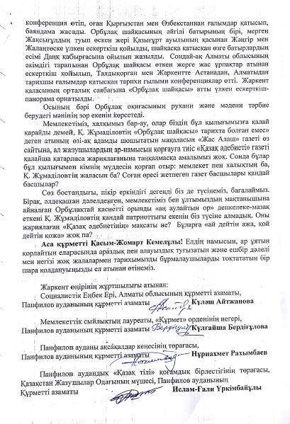 Мемлекетіміз, халқымыз бар-ау, олар біздің бұл қылығымызға қалай қарайды демей, Қ. Жұмаділовтің «Орбұлақ шайқасы» тарихта болған емес» деген атының өзі-ақ адамды шошытатын мақаласын «Жас Алаш» газеті өз сайтына, ал жазушылардың ар-намысын қорғауға тиіс «Қазақ әдебиеті» газеті қалайша қатарласа жариялағанына таңқалмасқа амалымыз жоқ. Сонда бұлар бұл қылығымен кімнің мүддесін қорғап отыр: мемлекет пен халықтың ба, Қ. Жұмаділовтің жаласын ба? Соған өресі жетпеген газет басшылары қандай басшылар?