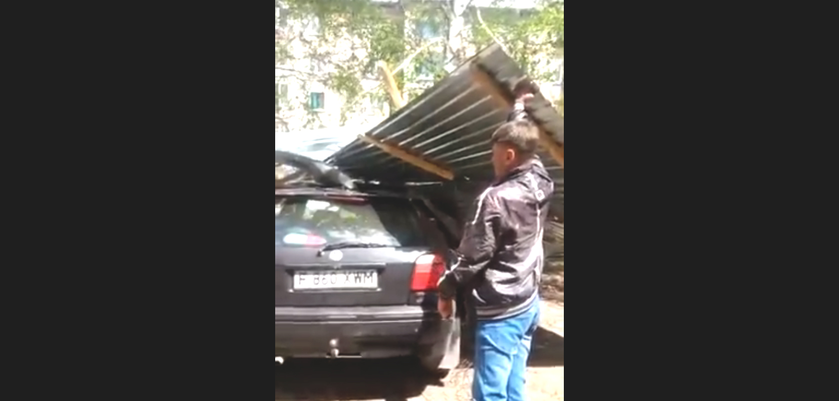 Екпіндей соққан дауыл Комаров көшесіндегі көпқабатты тұрғын үйлердің бірінің шатырын жұлып кетті. Желдің екіпінімен жоғары көтерілген қаңылтыр шатыр аулада тұрған автомобильге құлаған.