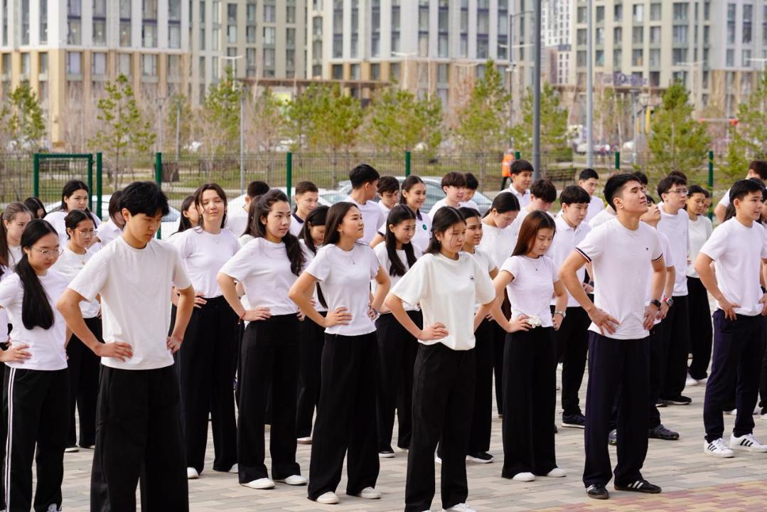 Бірыңғай флешмоб барысында оқушылар тазалық пен салауатты өмір салтын дәріптейтін түрлі спорттық би қойылымдарын қойып, ұжымдық әрекеттер ұйымдастырды.